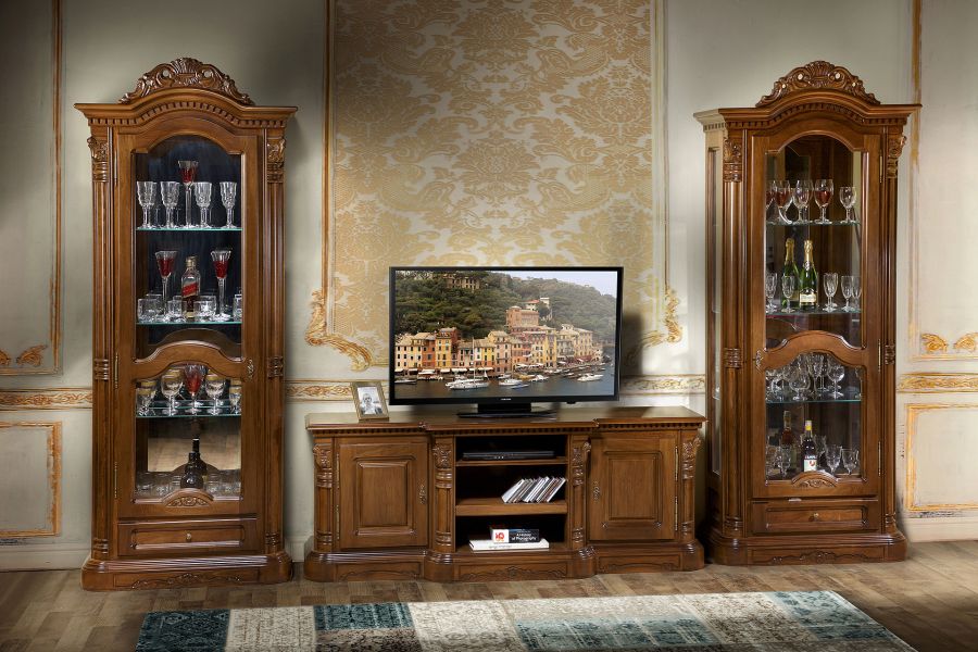 Luxusná rustikálna komoda pod TV z masívneho dreva, zdobená ručnou rezbou.