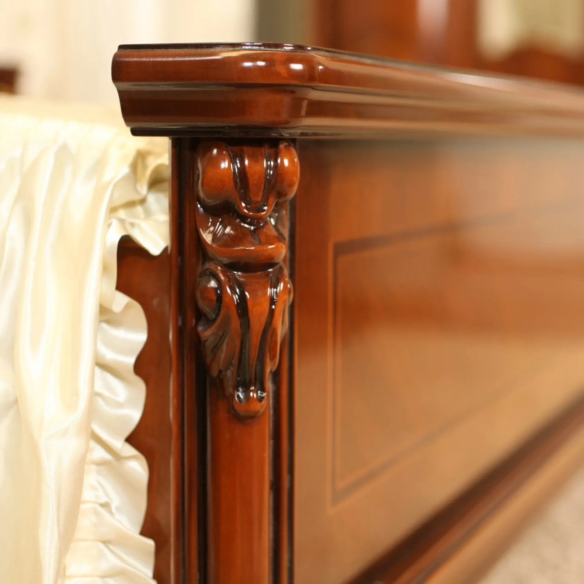 Luxusná rustikálna posteľ z masívneho dreva, zdobená ručnou rezbou.