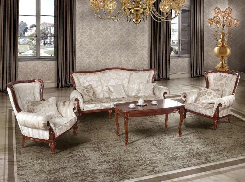 Luxusná rustikálna sedačka 3 miestna z masívneho dreva, zdobená ručnou rezbou a čalúnená luxusnou kvalitnou látkou.