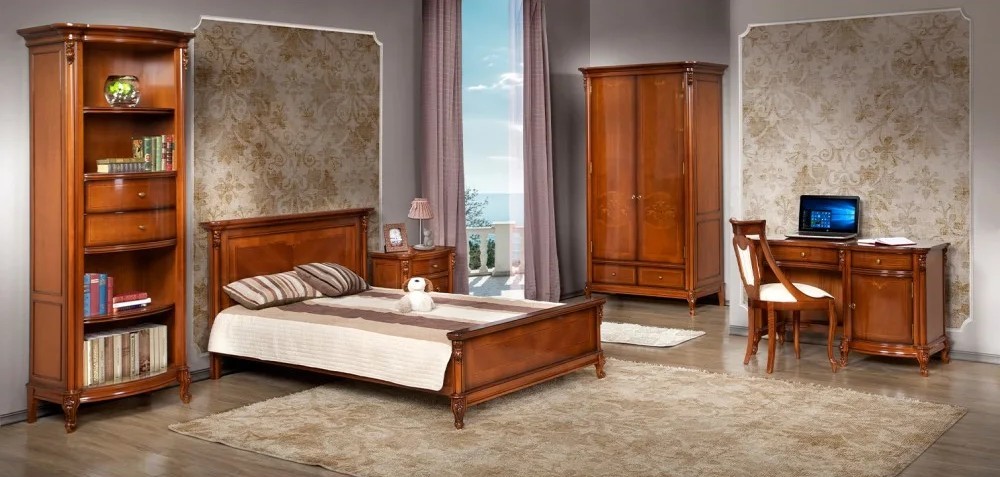 Luxusná rustikálna knižnica úzka z masívneho dreva, zdobená ručnou rezbou.