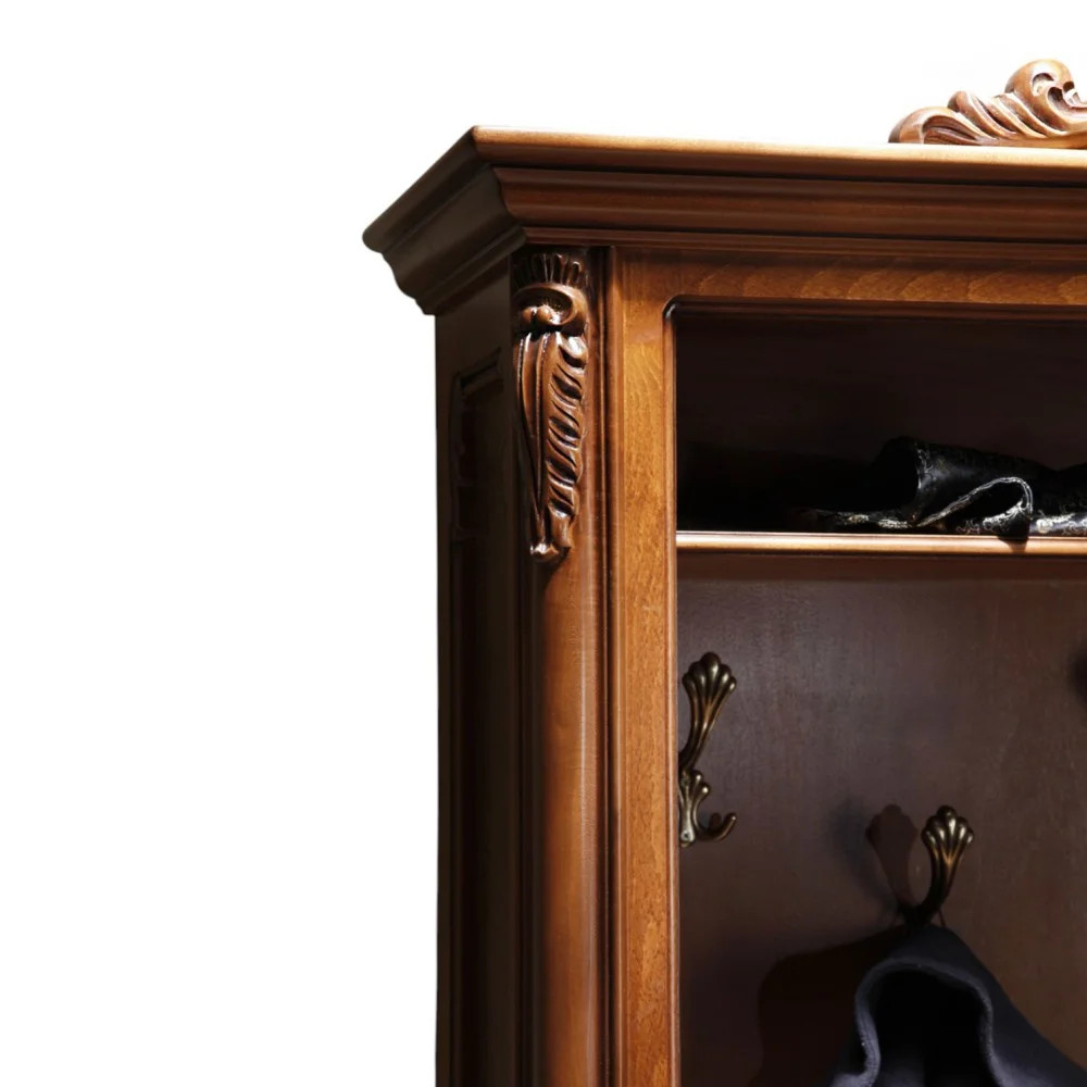 Luxusná rustikálna vešiaková stena z masívneho dreva, zdobená ručnou rezbou.