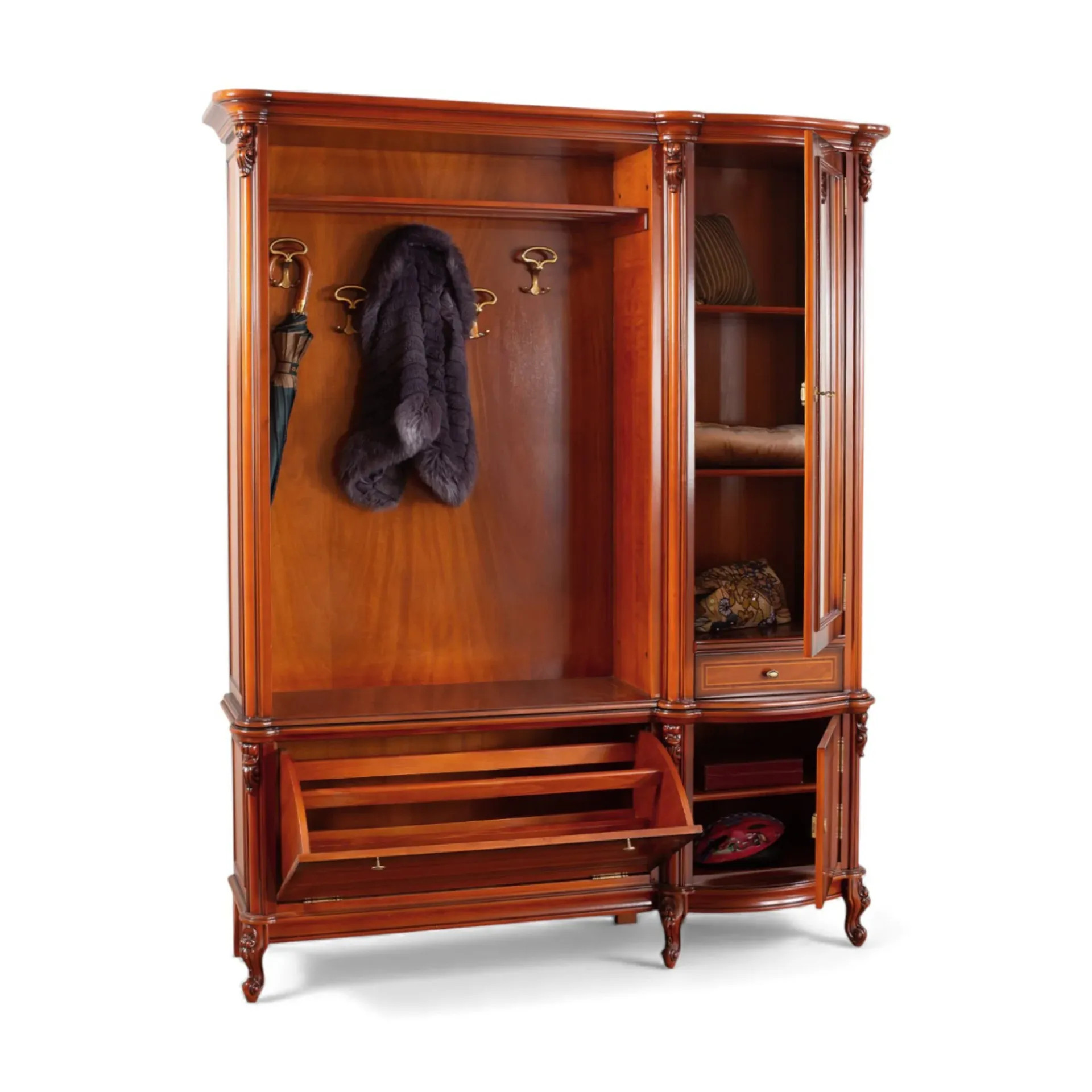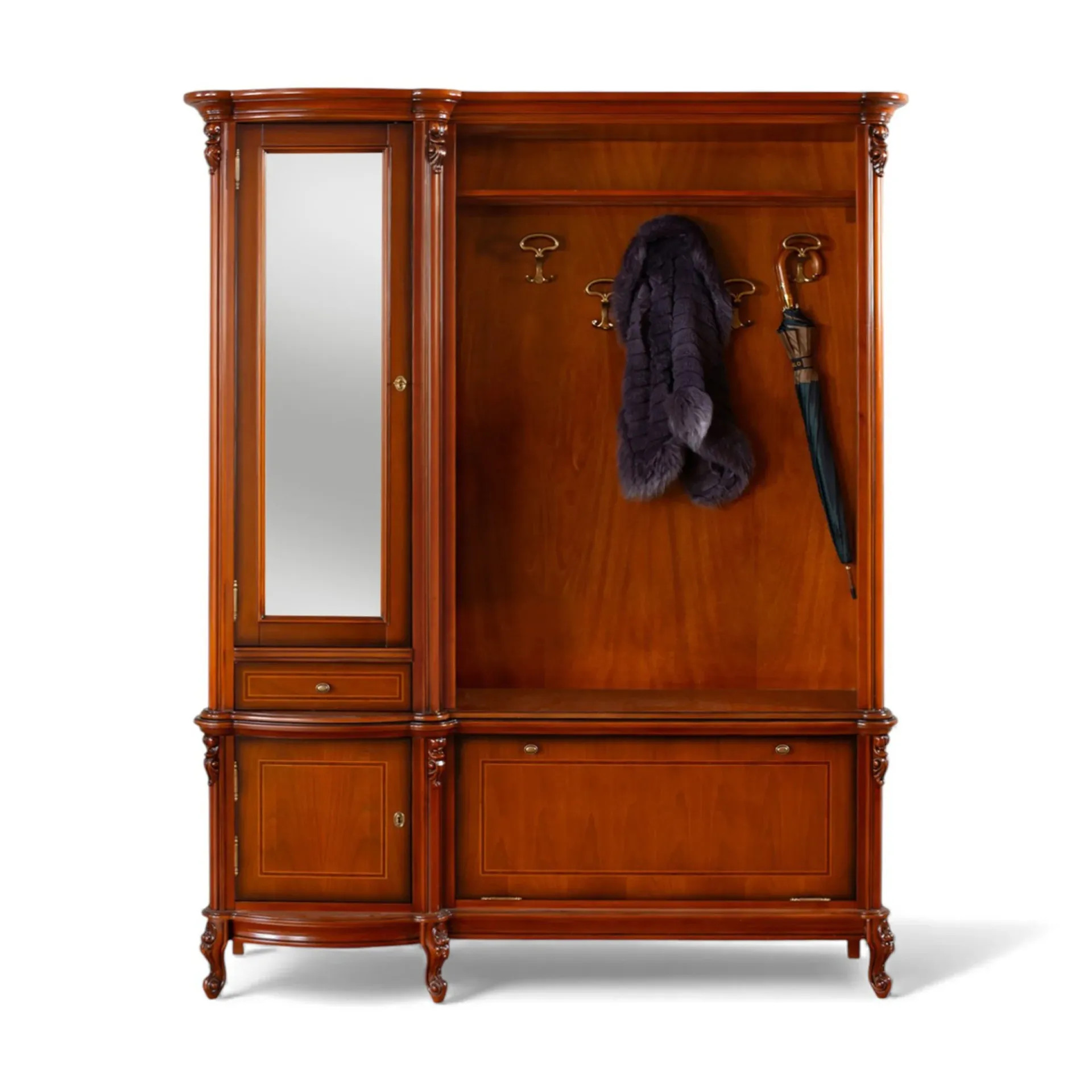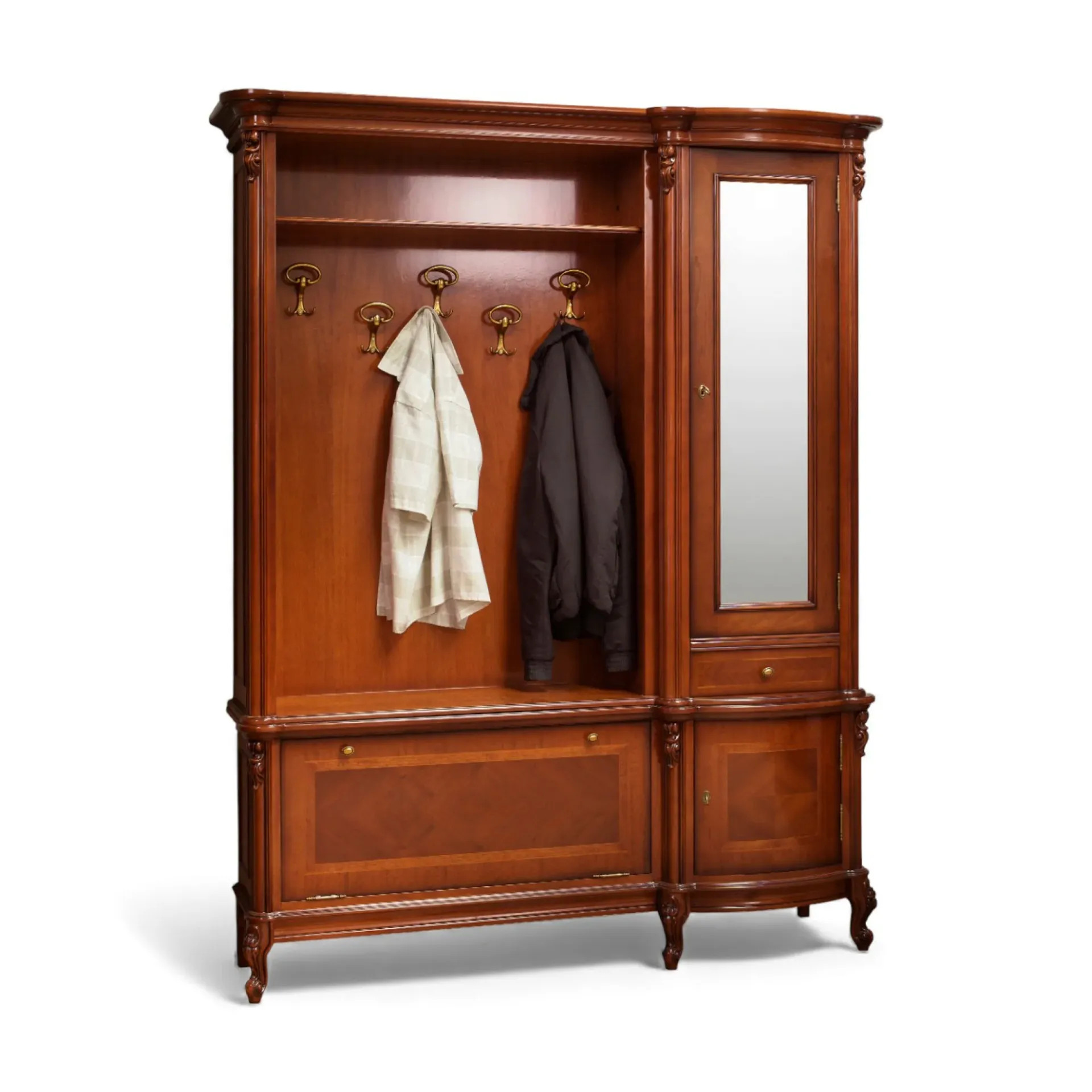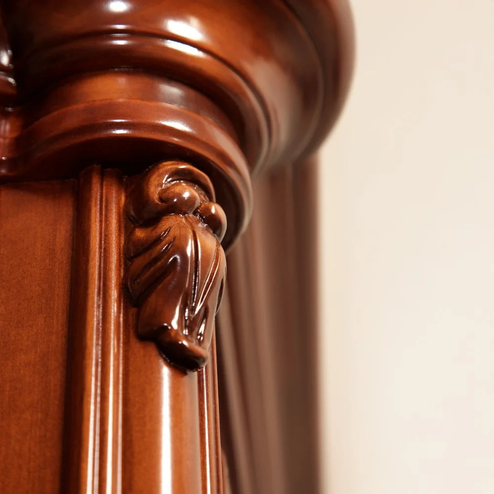 Luxusná rustikálna vešiaková stena z masívneho dreva, zdobená ručnou rezbou.