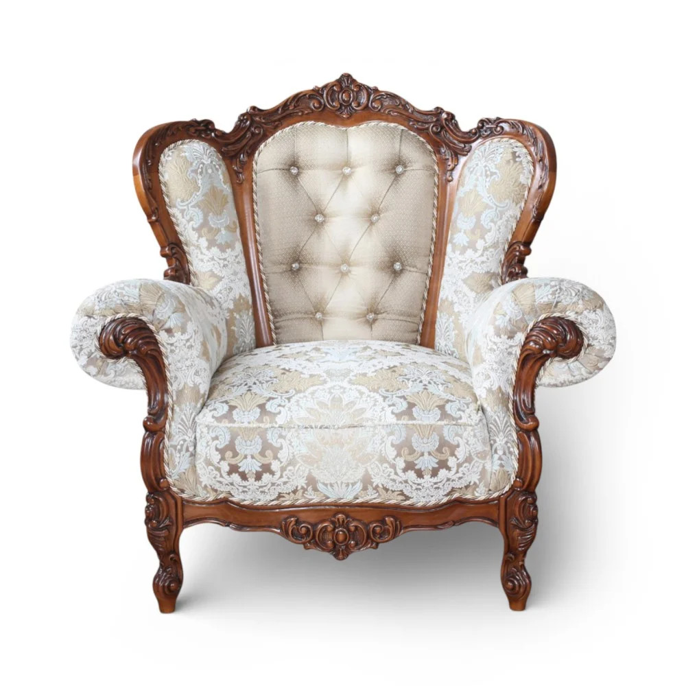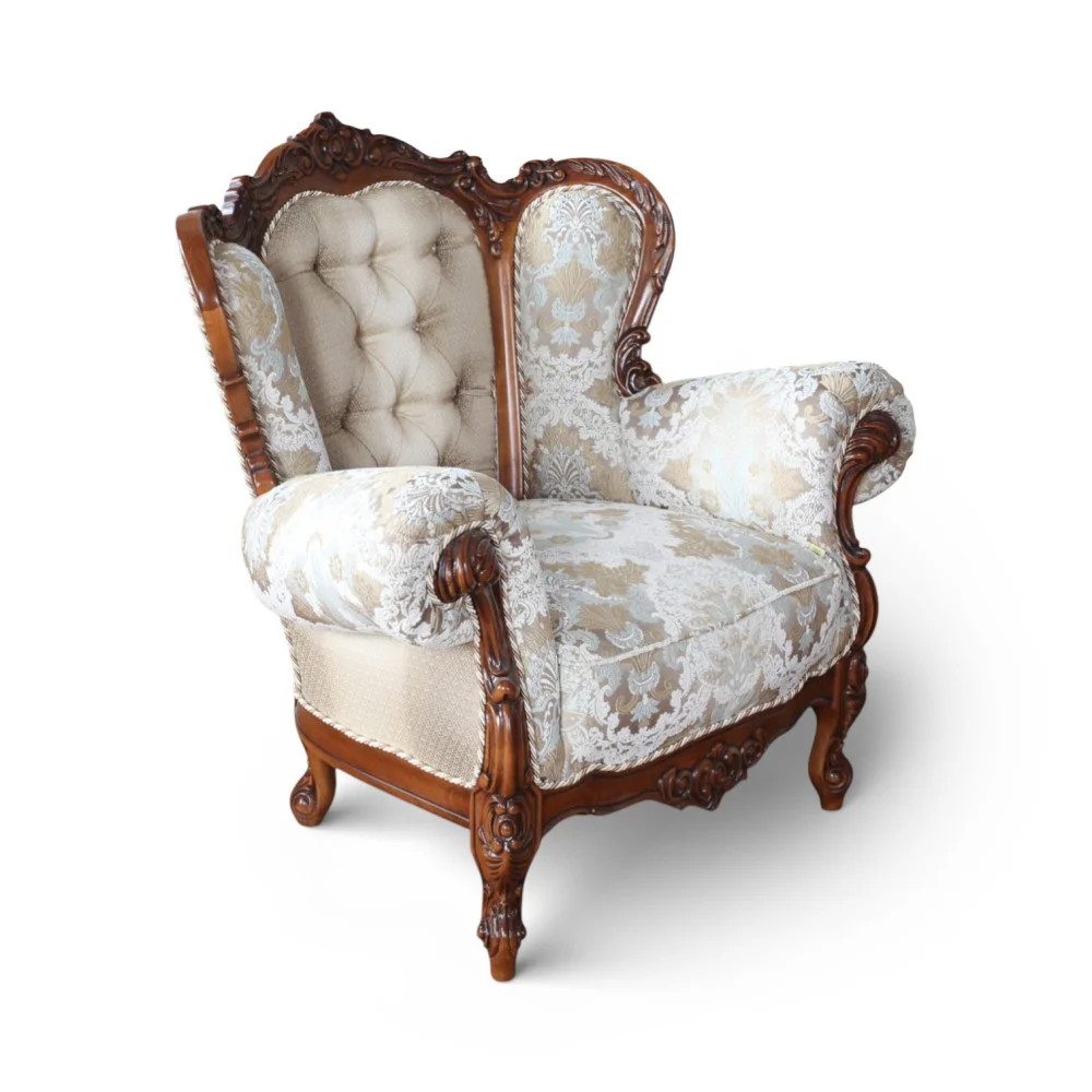 Luxusné rustikálne kreslo z masívneho dreva, zdobené ručnou rezbou a čalúnené luxusnou kvalitnou látkou.