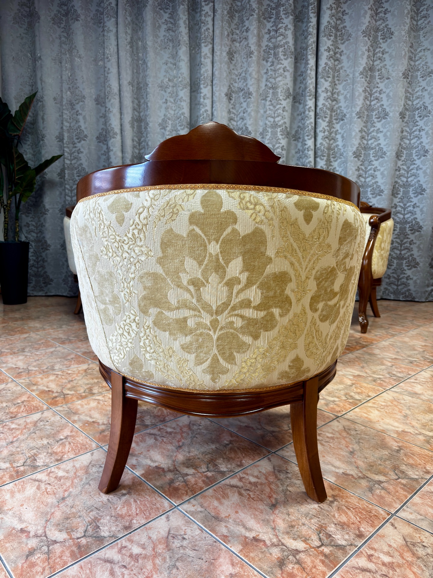 Luxusné rustikálne kreslo z masívneho dreva, zdobené ručnou rezbou a čalúnené luxusnou kvalitnou látkou.