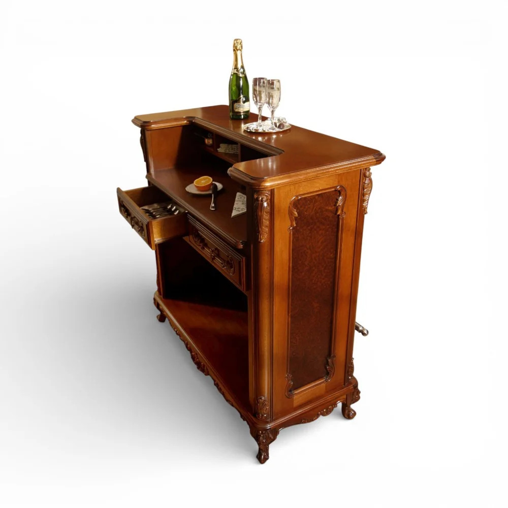 Luxusný rustikálny barový pult z masívneho dreva, zdobený ručnou rezbou.