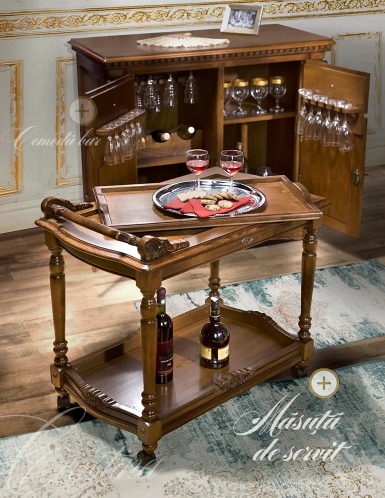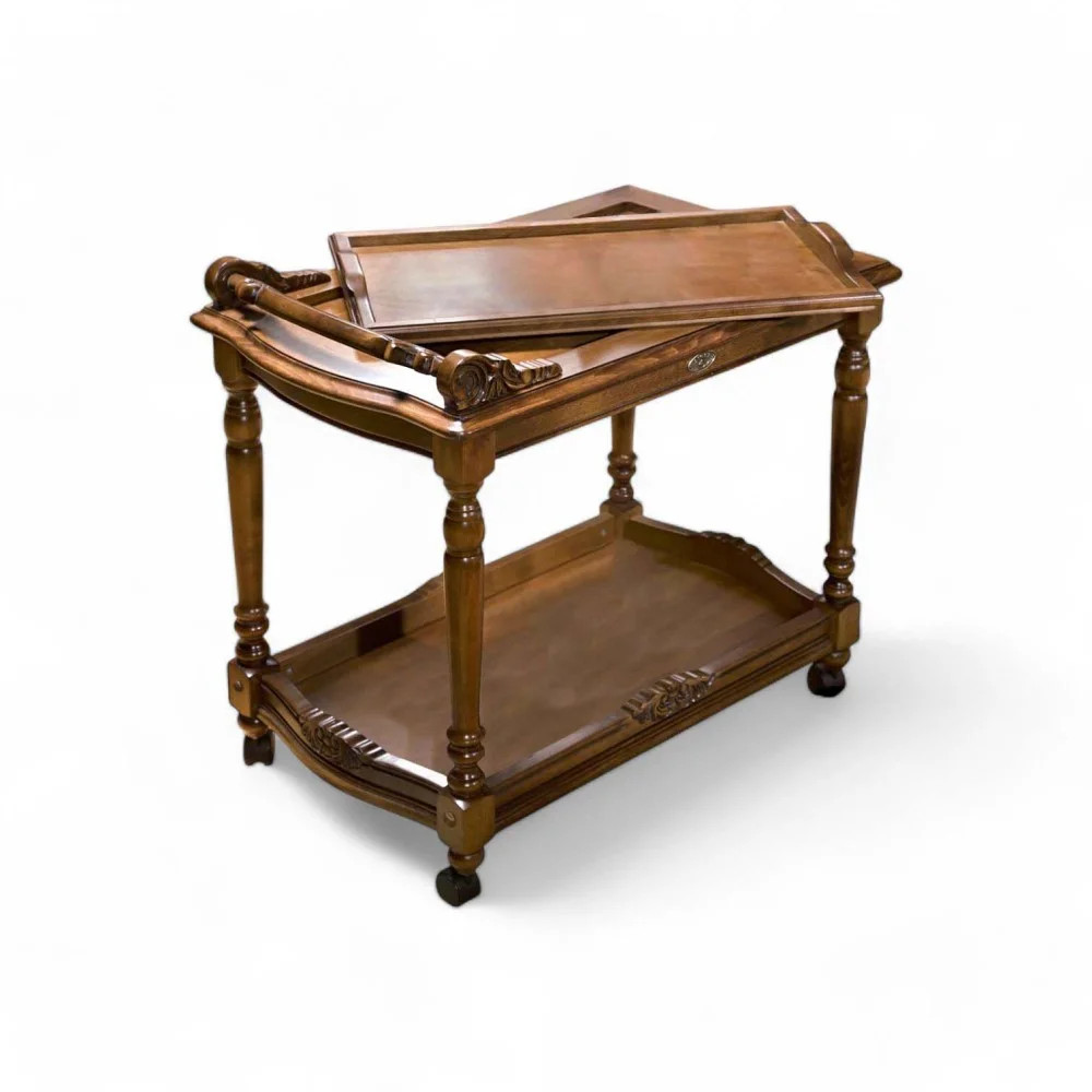 Luxusný rustikálny servírovací stolík z masívneho dreva, zdobený ručnou rezbou.