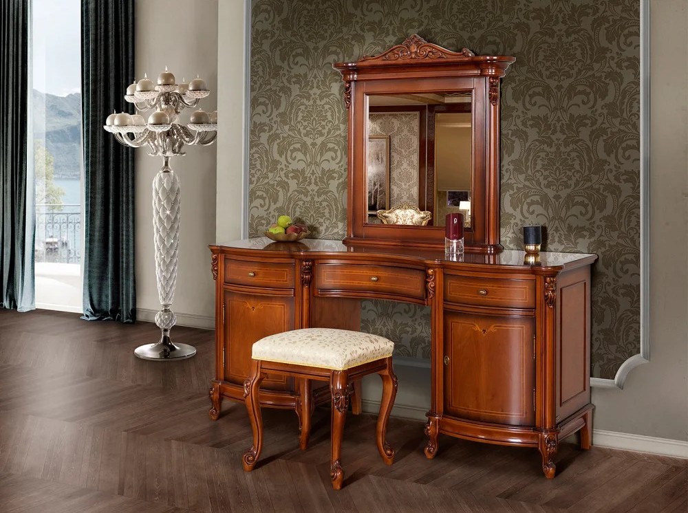 Luxusný rustikálny toaletný stolík z masívneho dreva, zdobený ručnou rezbou.